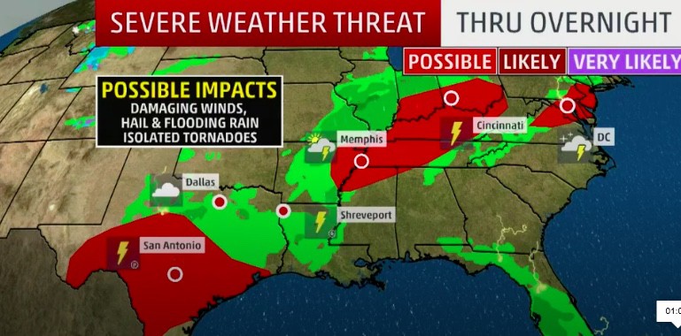 - Scattered severe storms are expected from Texas to the Ohio Valley and mid-Atlantic on Thursday.